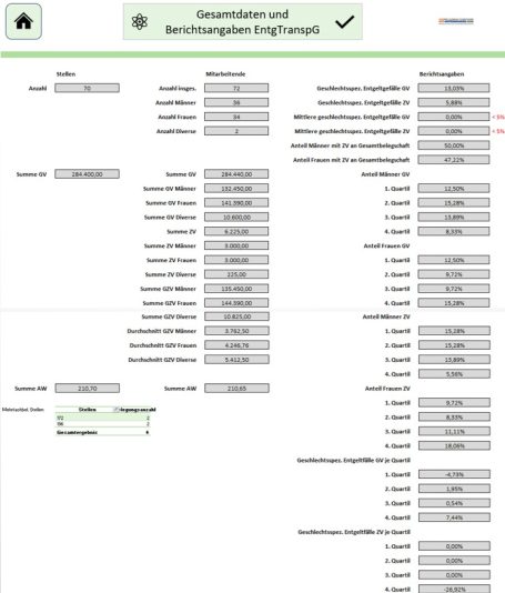 VerSAT (VergütungsStrukturAnalyseTool) ist die spezialisierte Softwarelösung für die Anforderungen der EU-Entgelttransparenzrichtlinie (EU 2023/970). Die Software berechnet alle relevanten Kennzahlen gemäß Artikel 7 und 9 der Richtlinie – auf Stunden- und Jahresbasis, nach Vergleichsgruppen und getrennt nach Geschlecht.