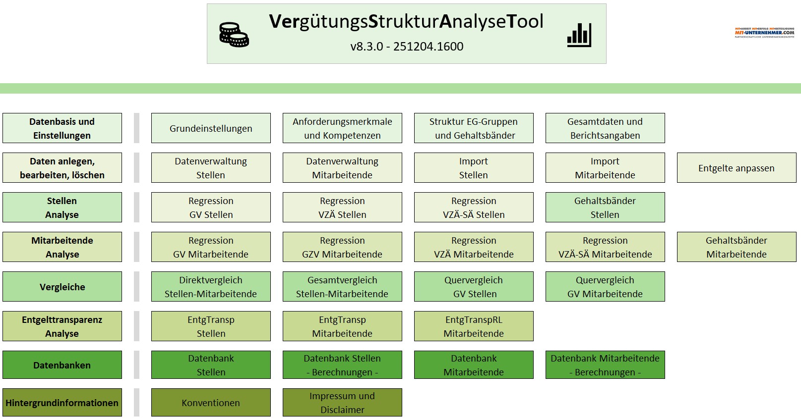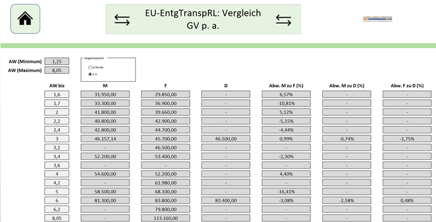 VerSAT (VergütungsStrukturAnalyseTool) ist die spezialisierte Softwarelösung für die Anforderungen der EU-Entgelttransparenzrichtlinie (EU 2023/970). Die Software berechnet alle relevanten Kennzahlen gemäß Artikel 7 und 9 der Richtlinie – auf Stunden- und Jahresbasis, nach Vergleichsgruppen und getrennt nach Geschlecht.